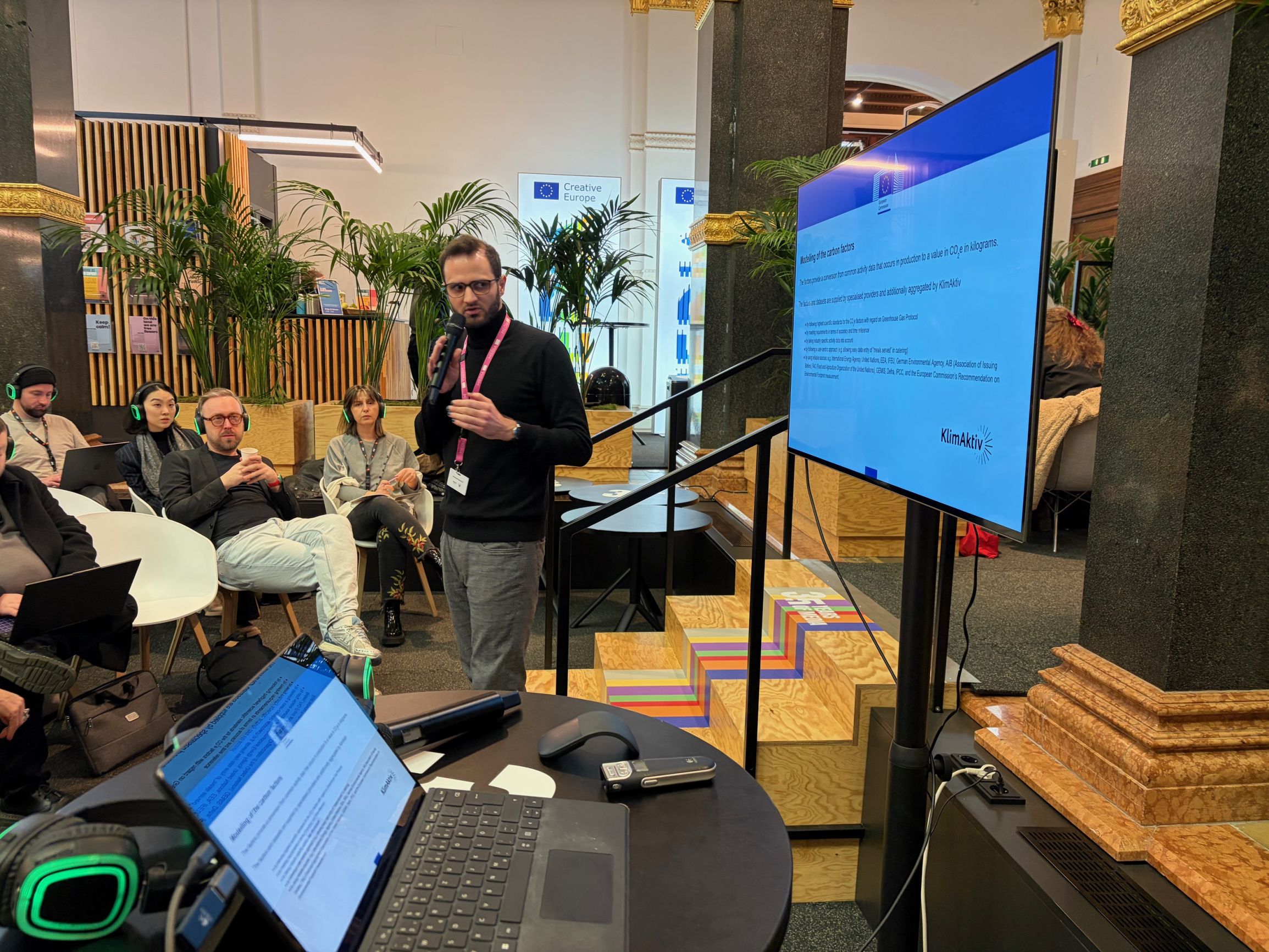 Am Freitag, dem 13. Februar, präsentierten Florian Reimann, CEO von Yamdu, und unser Kollege Justin Janßen beim European Film Market (EFM) den MEDIA Carbon Calculator. Am Stand von Creative Europe MEDIA gaben sie einen Überblick über die Wichtigkeit der Treibhausgasreduktion im audiovisuellen Sektor und erläuterten Features und Methodologie des Rechners. Es folgte eine kurze Live-Demo anhand eines Beispielprojekts und ein abschließendes Q&A.