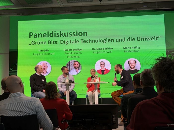 Bei der Abschlussveranstaltung des Green Tech Innovationswettbewerbs im Forum Digitale Technologien in Berlin durften wir unsere Resultate und den Prototypen des Streaming-CO2-Rechners vorstellen. Robert Seeliger von Fraunhofer FOKUS hat unser Projekt im Panel „Green Bits: Digitale Technologien und die Umwelt“ vertreten (s. Foto).