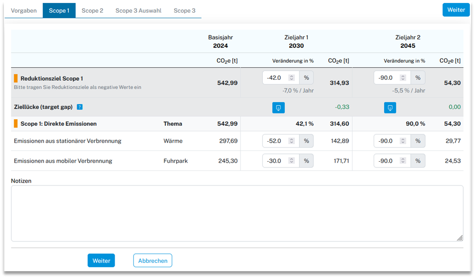 Bei der Erstellung eines Reduktionsziels haben Sie die Möglichkeit auszuwählen, welche Scopes Sie mit ihrem Ziel abdecken möchten. So können Sie beispielsweise ein Ziel für Scope 1 und 2 definieren oder direkt alle drei Scopes in den Blick nehmen. Basis Ihres Ziels ist die Bilanz Ihres Basisjahres. Das Ziel kann mehrere Zieljahre als Zwischenziele umfassen, bis zu welchen eine bestimmte Treibhausgasemissionsreduktion erreicht werden soll. Üblich ist die Definition eines kurzfristigen (z.B. 2030) sowie eines langfristigen Reduktionsziels (z.B. 2045).