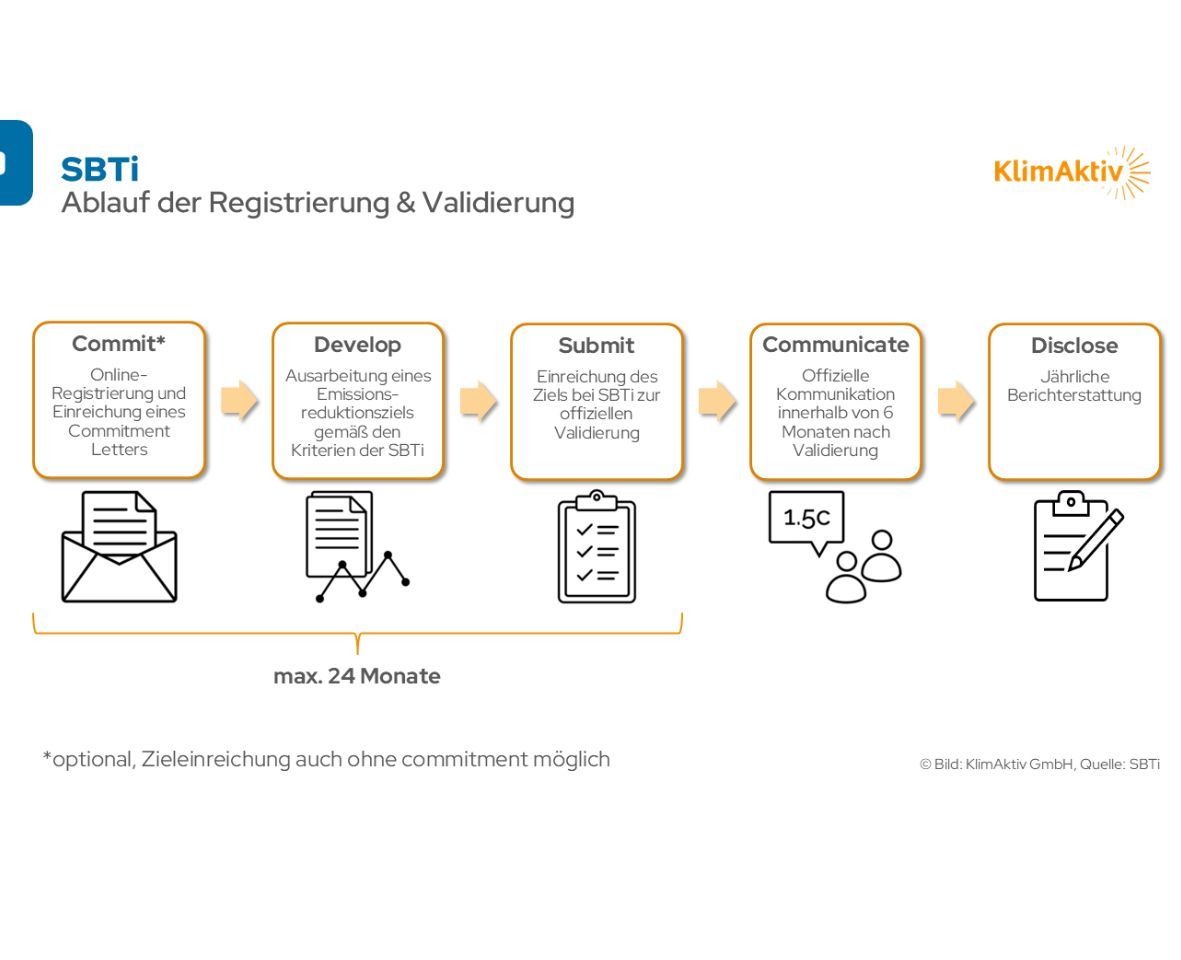 Die Initiative baut auf Selbstverpflichtung und Transparenz: Unternehmen können sich in einem ersten Schritt offiziell zu Science Based Targets verpflichten (sog. commitment) und werden ab diesem Zeitpunkt öffentlich im „Target Dashboard“ auf der Website der SBTi gelistet. Anschließend hat das Unternehmen zwei Jahre Zeit, seine Klimaziele einzureichen und validieren zu lassen. Die Validierung, d.h. die Prüfung auf Konformität der Klimaziele mit den SBTi Standards, erfolgt kostenpflichtig durch die SBTi Services Limited, ein hundertprozentiges Tochterunternehmen der Stiftung. Für die Einreichung der Ziele werden seitens der SBTi Informationen und Instrumente zur Verfügung gestellt. Die Zielerreichung, d.h. die kontinuierliche Reduktion der Emissionen, wird in regelmäßigen Abständen überprüft.