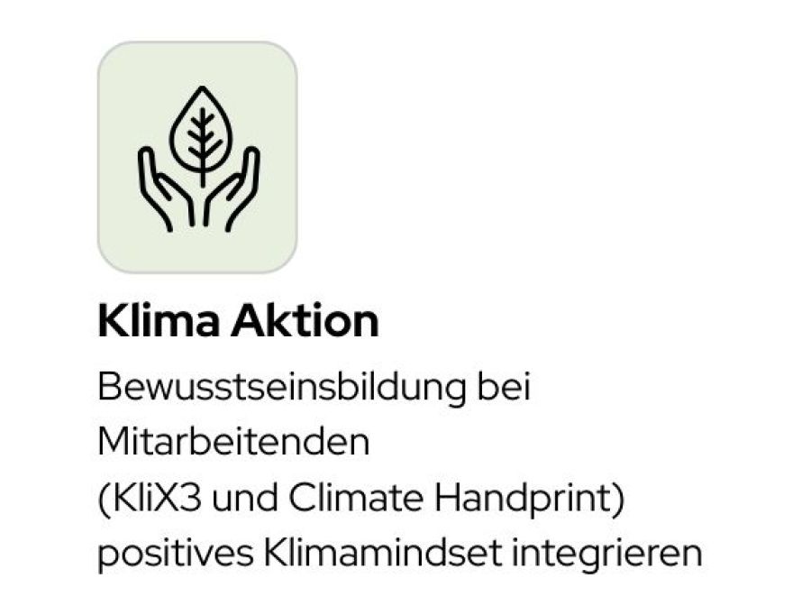 Gerade an den Schnittstellen zur unternehmerischen Klimastrategie kommt es auch auf das persönliche Bewusstsein an. So unterstützen Sie durch Bewusstseinsbildung die Umsetzung Ihrer Klimaschutzziele. Oft ist zum Beispiel das nachhaltige Pendeln der Mitarbeitenden ein Hebel zum Erreichen der Klimaschutzziele in Scope 3. Durch Maßnahmen zur Bewusstseinsbildung kann hier ein Umdenken stattfinden. KlimAktiv ist für die Unternehmenskampagne von KliX3 verantwortlich. Die Teilnahme ist für Unternehmen kostenlos. Über die Website von KliX³ können die Mitarbeitenden teilnehmender Unternehmen auf Basis der individuellen CO₂-Bilanz einen persönlichen Klimaschutzplan entwickeln. Die Unternehmen erhalten ein kostenloses Bildungspaket zur Motivation aller Kolleginnen und Kollegen.