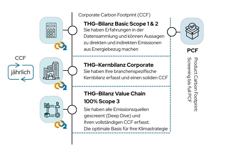 Der erste Schritt ist die Erstellung der THG-Bilanz Basic Scope 1 & 2, also für alle Emissionen, die durch den eigenen Energieverbrauch, den Betrieb von Anlagen und Fahrzeugen oder den Einkauf von Strom und Wärme entstehen.
